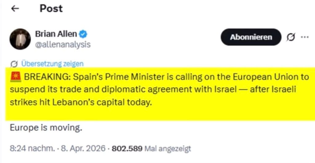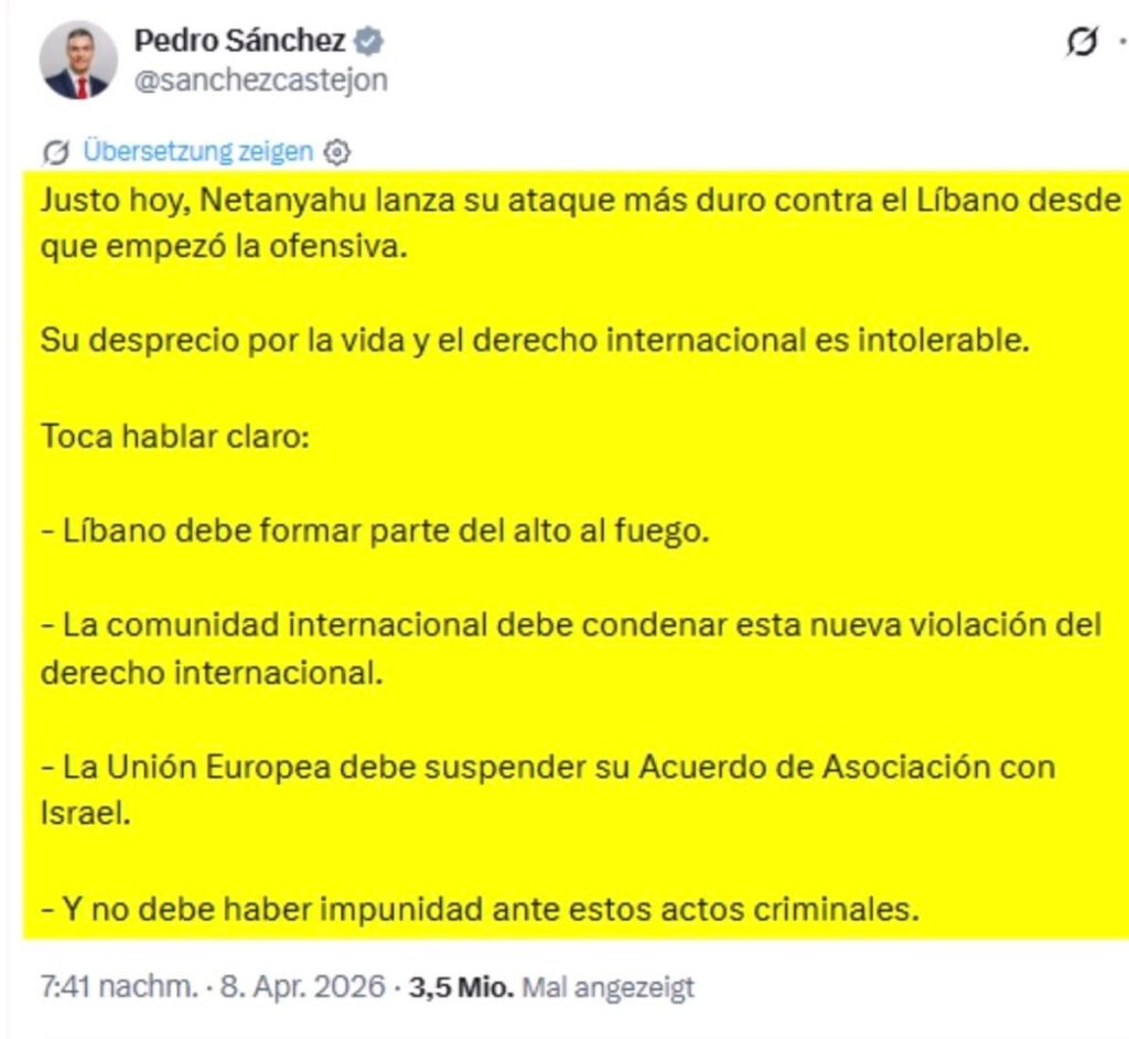 Sánchez jasne požadoval: Libanon musí byť zahrnutý do prímeria, medzinárodné spoločenstvo musí odsúdiť toto nové porušenie medzinárodného práva, EÚ by mala pozastaviť svoje asociačné dohody s Izraelom a tieto kriminálne činy nesmú zostať bez trestu.