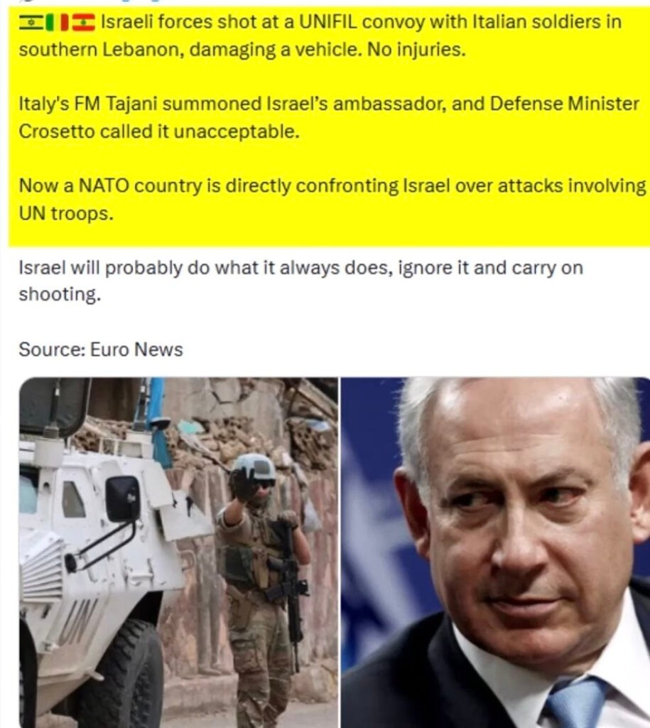Aj Taliansko ostro protestovalo. Izraelské sily vystrelili varovné výstrely na jasne označený konvoj UNIFIL s talianskym transportom (zo Shamy do Bejrútu). Jedno vozidlo bolo poškodené, našťastie nedošlo k zraneniam. Taliansky minister zahraničných vecí Tajani a minister obrany Crosetto si predvolali izraelského veľvyslanca. Premiérka Giorgia Meloni incident odsúdila a vyzvala Izrael, aby okamžite zastavil útoky v Libanone. Takéto incidenty s mierovými jednotkami OSN – vrátane smrti troch indonézskych vojakov UNIFIL koncom marca – vyvolávajú medzinárodné pobúrenie a nastoľujú vážne otázky o rešpektovaní misií OSN.