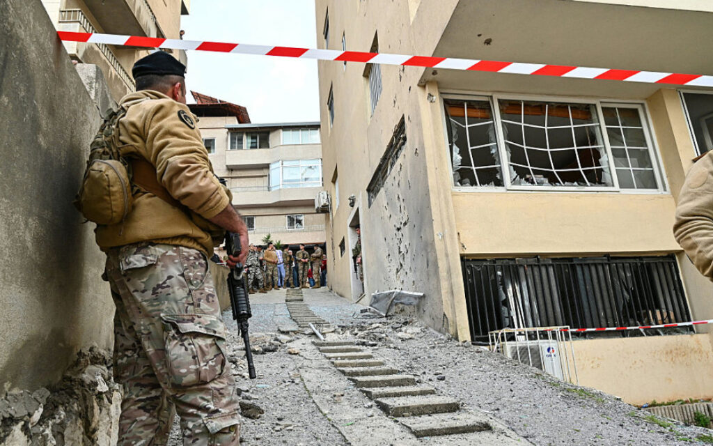 Libanonskí vojaci stoja na mieste, kde podľa úradov 24. marca 2026 v meste Sahel Alma severne od Bejrútu dopadli úlomky zostrelenej rakety. Foto: Fadel Iltani/AFP via Getty Images