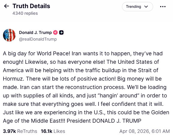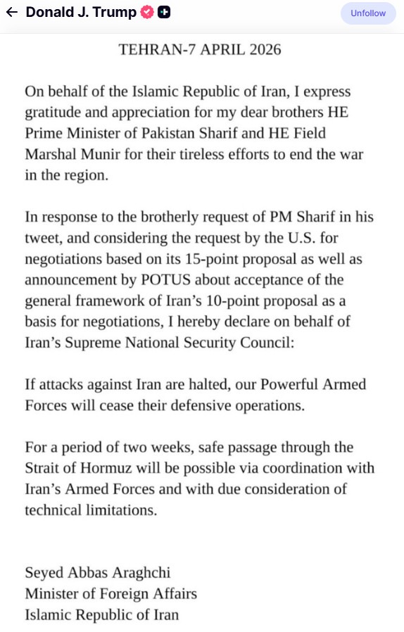 Dostali sme 10-bodový návrh od Iránu a veríme, že je to použiteľný základ pre rokovania. Spojené štáty a Irán sa zhodli takmer na všetkých bodoch, ktoré boli v minulosti predmetom sporov, ale dvojtýždňové obdobie umožní dohodu finalizovať a uzavrieť. V mene Spojených štátov amerických, ako prezident, a tiež v zastúpení krajín Blízkeho východu, je mi cťou, že tento dlhodobý problém sa blíži k vyriešeniu. Ďakujem za vašu pozornosť venovanú tejto záležitosti! Prezident DONALD J. TRUMP