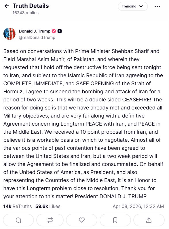 „Po rozhovoroch s premiérom Shehbazom Sharifom a poľným maršalom Asimom Munirom z Pakistanu, ktorí ma požiadali, aby som zadržal ničivú silu namierenú proti Iránu plánovanú na dnešný večer, a za predpokladu, že Islamská republika Irán súhlasí s úplným, okamžitým a bezpečným otvorením Hormuzského prielivu, súhlasil som s pozastavením bombardovania a útokov na Irán na dva týždne. Bude to obojstranné prímerie!“, napísal Trump na svojej platforme Truth Social.