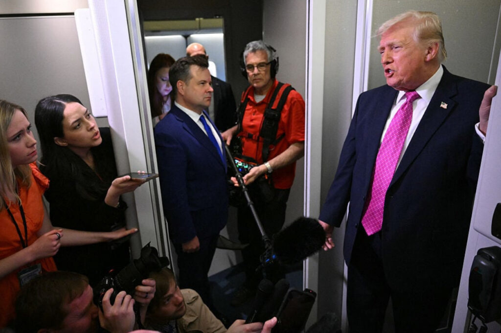 Americký prezident Donald Trump hovorí s novinármi 29. marca 2026 na palube lietadla Air Force One počas letu na základňu Joint Base Andrews v Marylande. Foto: Mandel NGAN / AFP via Getty Images