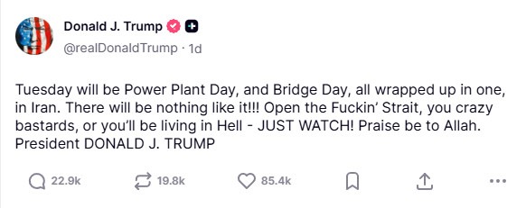 Von der Leyenová v Bruseli, Trump v Bielom dome – dve strany tej istej mince? Zatiaľ čo EÚ práve ničí národnú suverenitu a energetickú politiku, americký prezident Donald Trump na Veľkonočnú nedeľu predniesol vulgárne ultimátum Iránu: Utorok 7. apríla 2026 bude „Deň elektrární a Deň mostov“ v jednom. Elektrárne a mosty majú byť zničené, ak sa Hormuzský prieliv okamžite neotvorí. „Otvorte ten zasraný prieliv, vy šialení bastardi, alebo budete žiť v pekle – LEN SLEDUJTE!“ A potom ako korunovány posmech: „Chvála Alláhovi. Prezident DONALD J. TRUMP.“